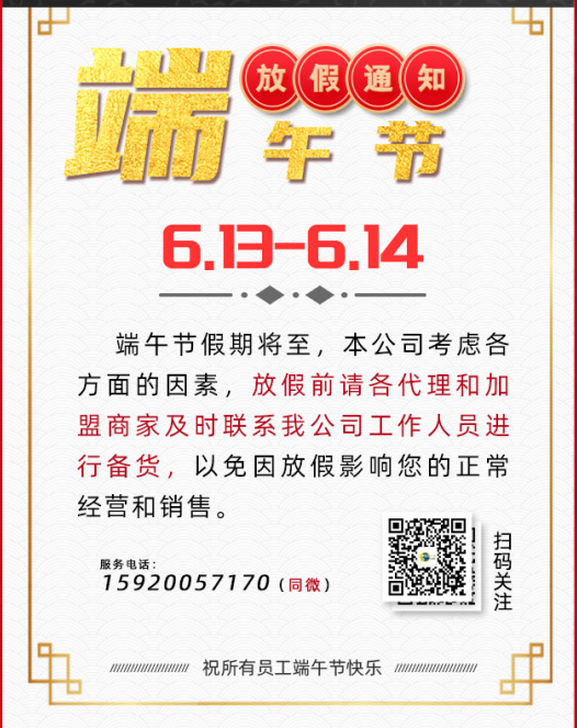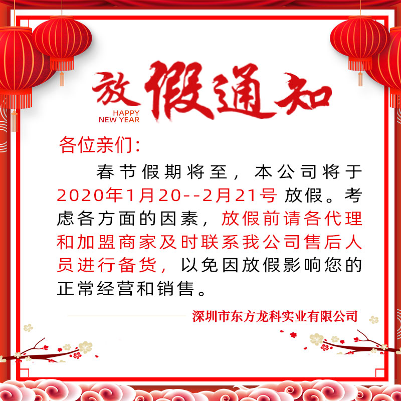 春節(jié)假期將至,東方龍科將于 2020年1月20--2月21號(hào) 放假??紤]各方面的因素,放假前請(qǐng)各代理和加盟商家及時(shí)聯(lián)系我公司售后人員進(jìn)行備貨,以免因放假影響您的正常經(jīng)營和銷售。