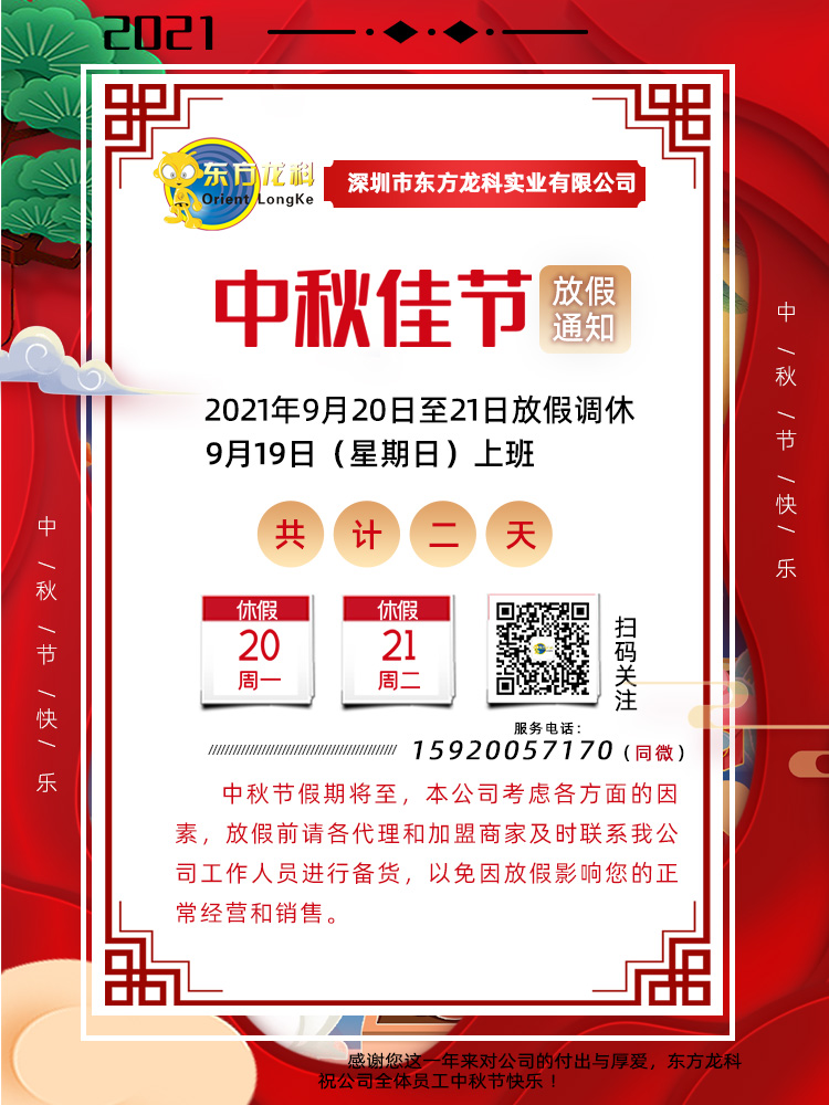 深圳市東方龍科實(shí)業(yè)有限公司2020年國慶中秋放假通知,放假時(shí)間為10月1日至10月5日,10月6號(hào)回來上班,放假期間客戶如有售后咨詢可撥打客服電話,也可撥打深圳總部值班電話159200571