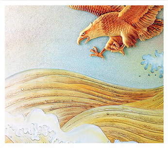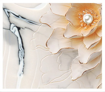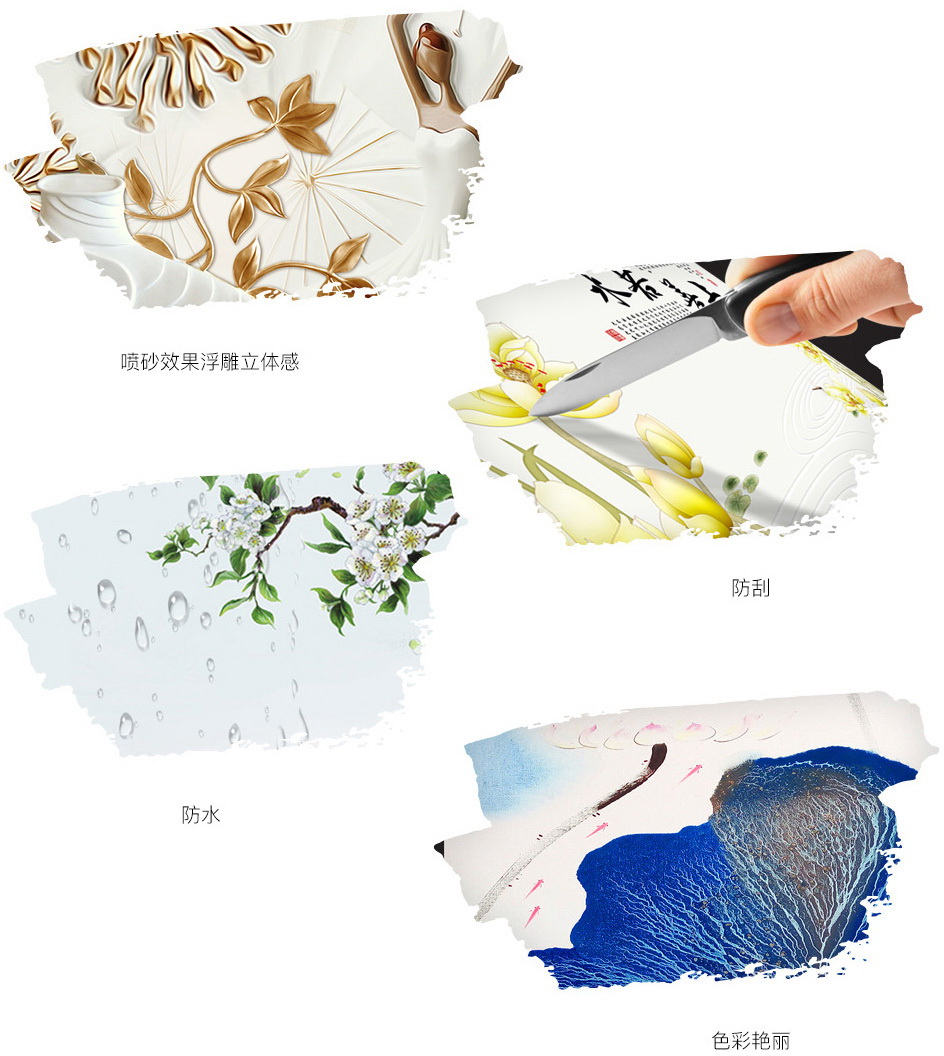 彩雕背景墻是在瓷磚上先用雕刻機和噴砂機按路徑打磨出立體效果,然后再打彩上油。市場上大部分浮雕(陰雕或陽雕)效果的瓷磚背景墻都是這種工藝。